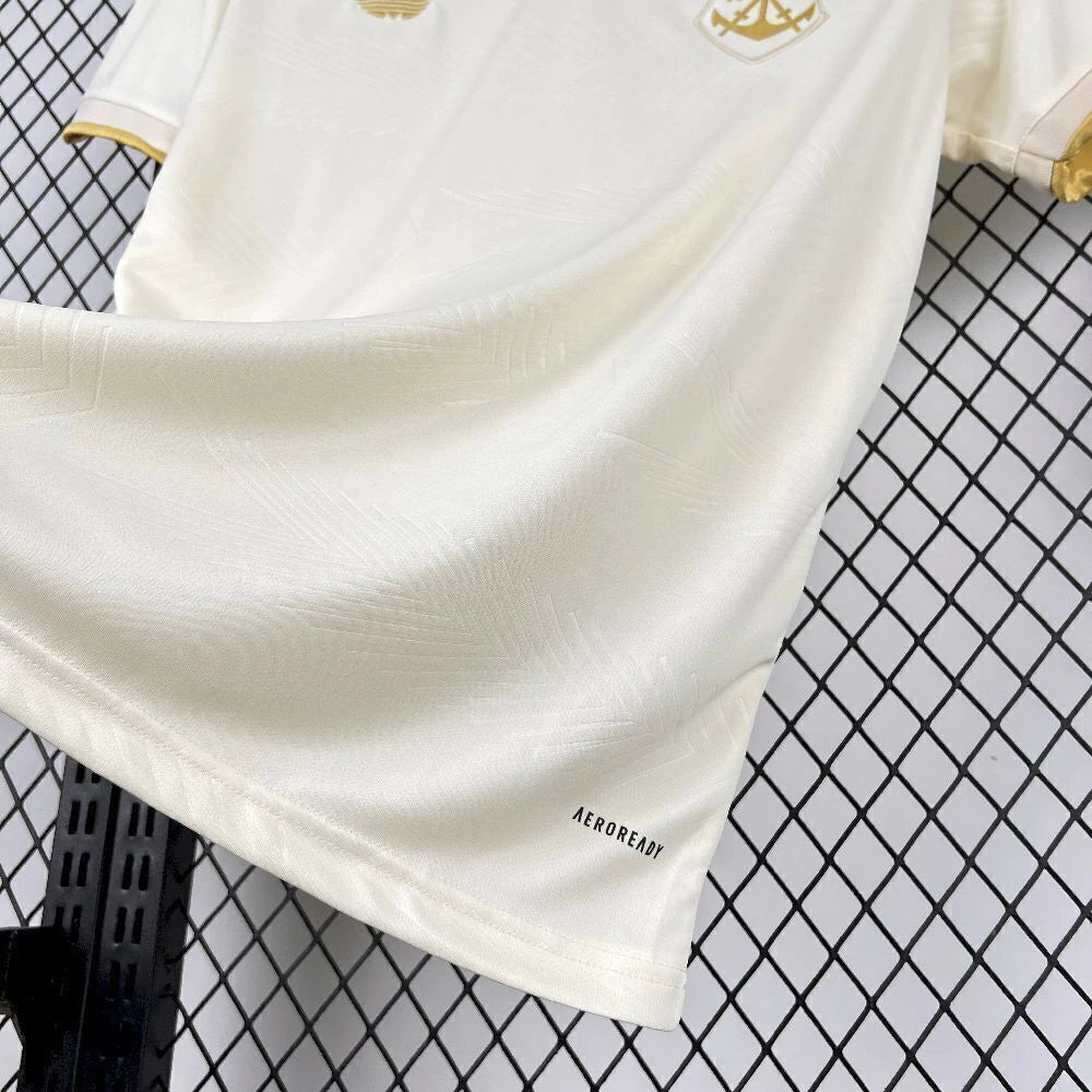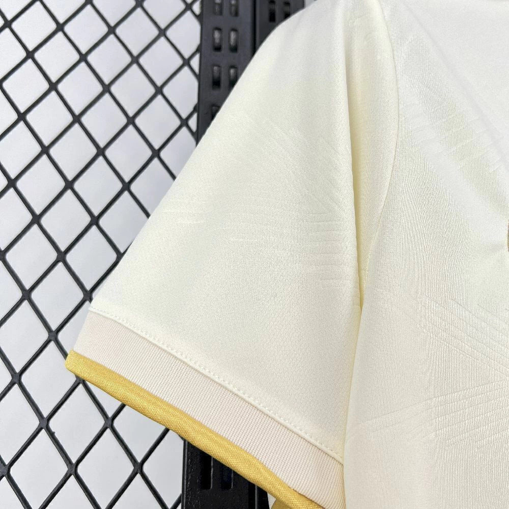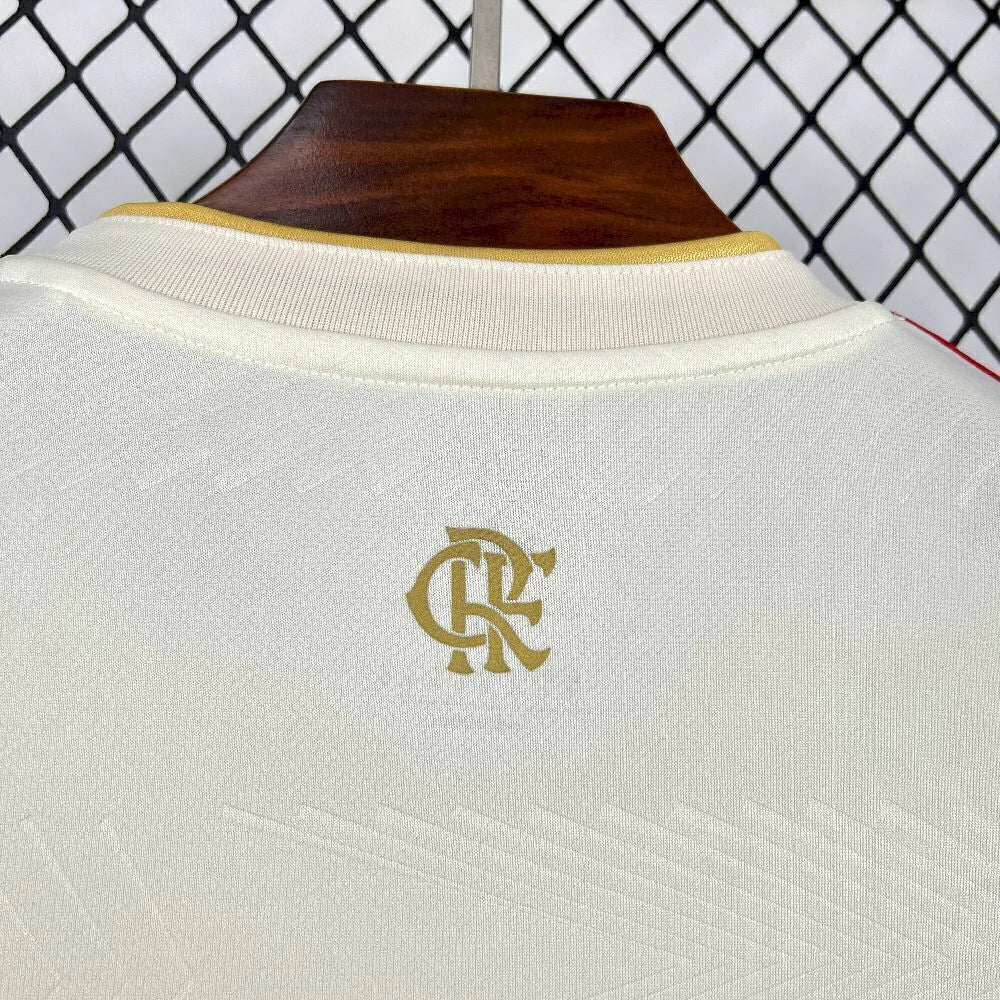 Toque premium: gola V e punhos com acabamento dourado; listras vermelha e preta nos ombros.